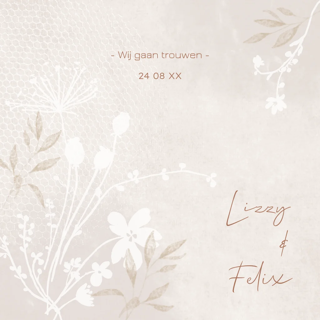 Een mooie trouw uitnodiging voor een bruiloft in zachte neutrale tinten. Op deze trouwkaart zie je illustraties van bloemetjes en tule in neutrale tinten. Deze kaart kun je naar eigen wens personaliseren door de kleuren en teksten aan te passen (30318)