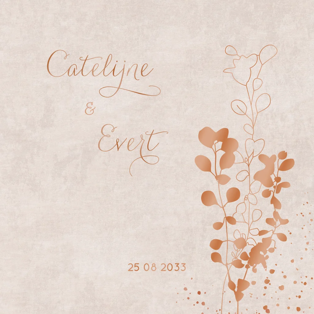 Een mooie stijlvolle trouwkaart voor jullie huwelijk met de namen en grafische eucalyptus takjes gedrukt met hoogglans inkt. Deze trouwkaart kun je zelf bewerken en heeft een neutrale zachte uitstraling door de velvet-look achtergrond. Bewerk deze trouwkaart zelf naar eigen idee door de kleuren eenvoudig aan te passen (30314)