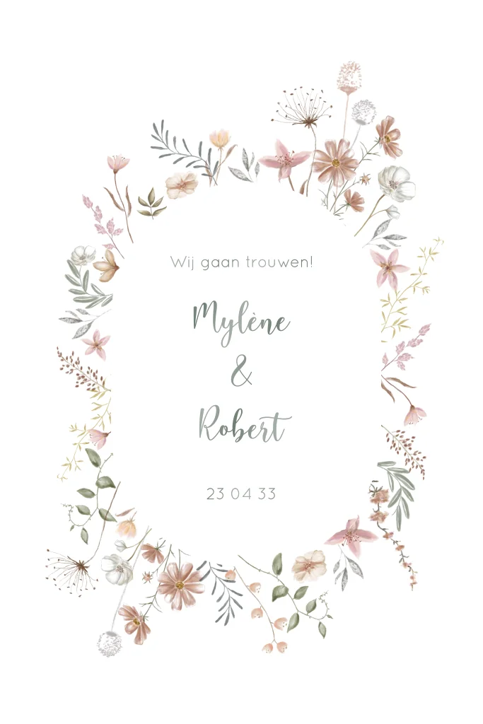 Een mooi staand formaat trouwkaart met een krans van kleine hand geschilderde bloemetjes. De namen zijn hier gedrukt met hoogglans inkt wat een luxe en chique uitstraling geeft. Deze kaart heeft ronde hoeken. Neem contact met ons op voor de trouwhuisstijl. Formaat 9x13, 10x15, 11x17, of 14x21 cm. (30414)