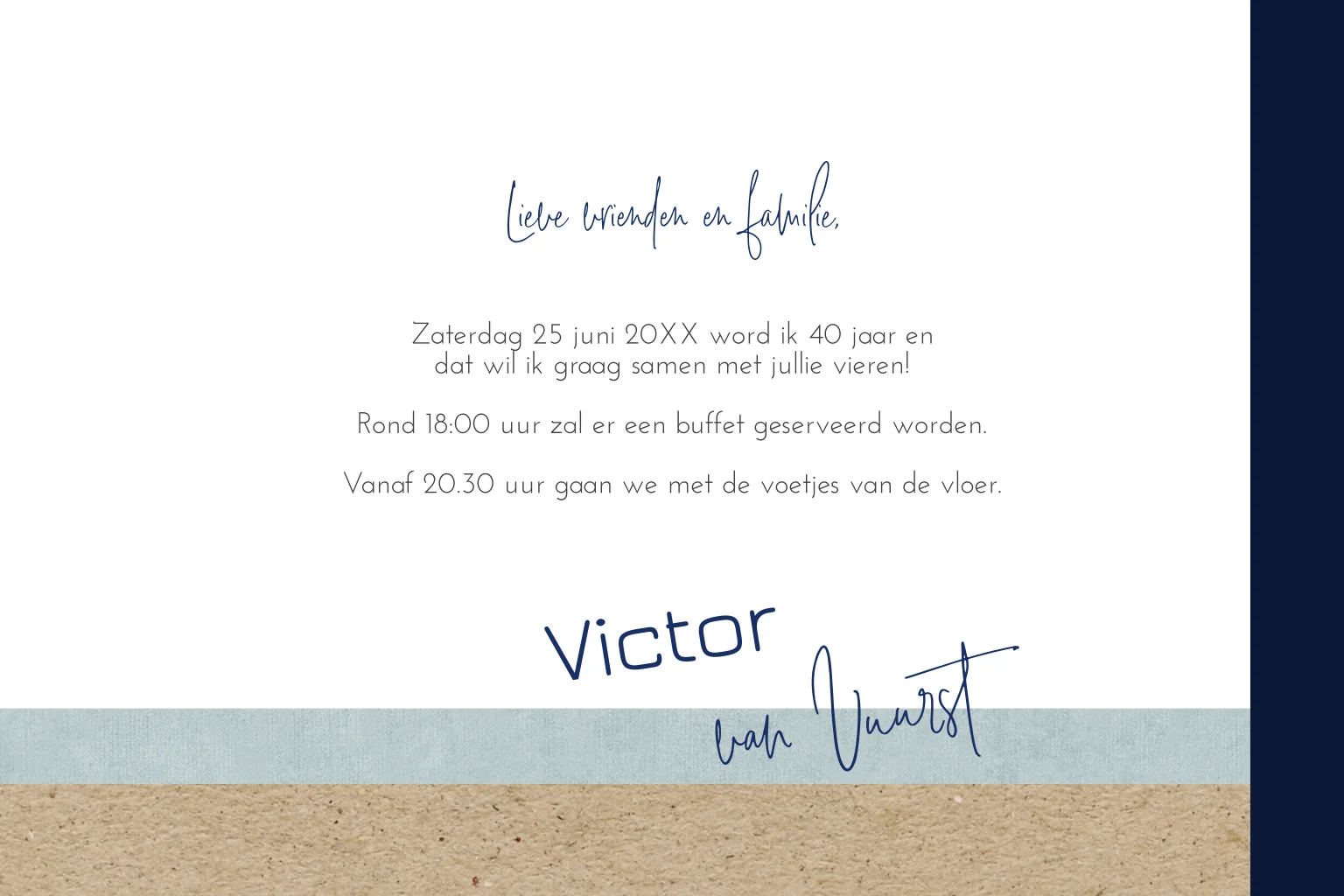 Deze stoere uitnodiging voor een feest met de vouw aan de linkerkant is opgebouwd uit kraft en blauwe tinten. Deze kaart is te bestellen in 10x15, 11x17 en 14x21 cm (30371)