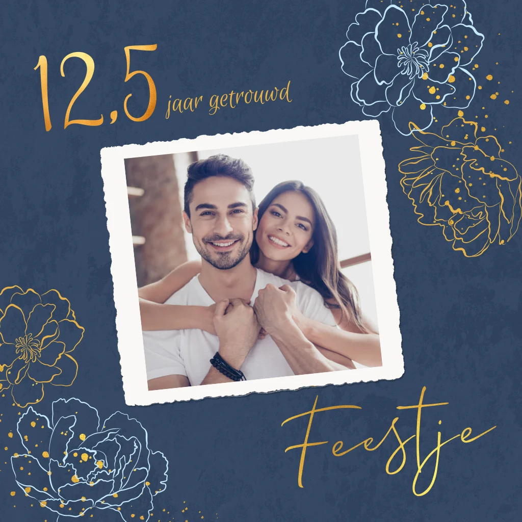 Deze stijlvolle uitnodiging kaart voor een 12,5 jarig jubileum kun je zelf bewerken door de foto, de kleuren en teksten te vervangen. Een mooie diep blauwe velvet achtergrond met goudkleurige teksten en bloemen geeft deze kaart een luxe uitstraling. (30385)