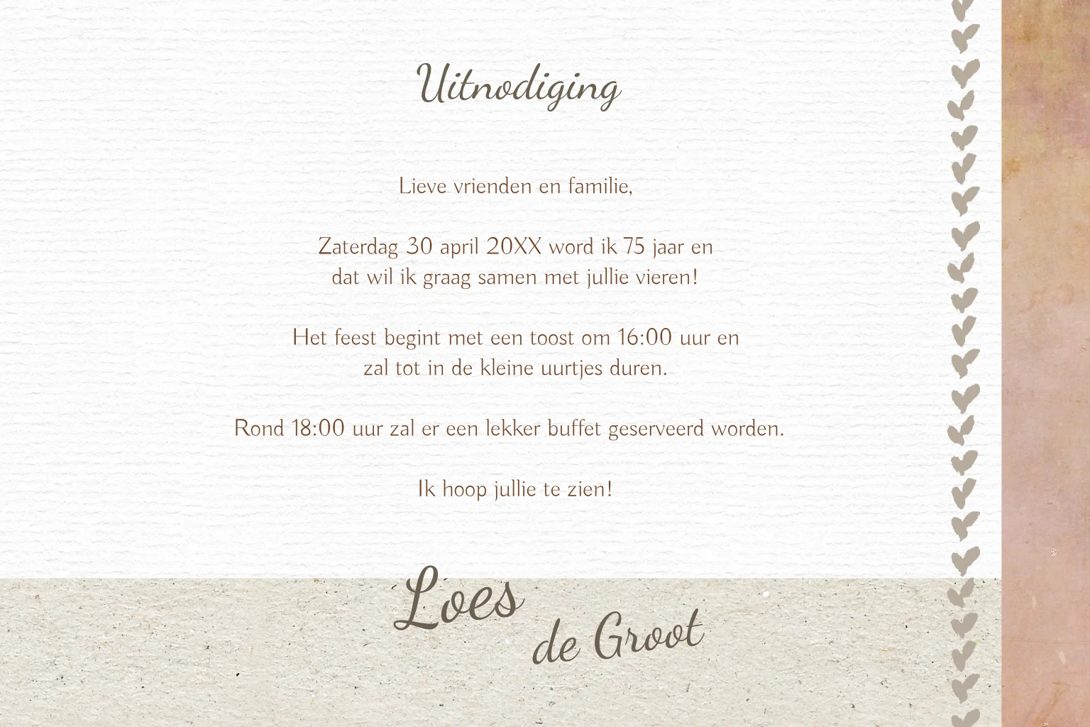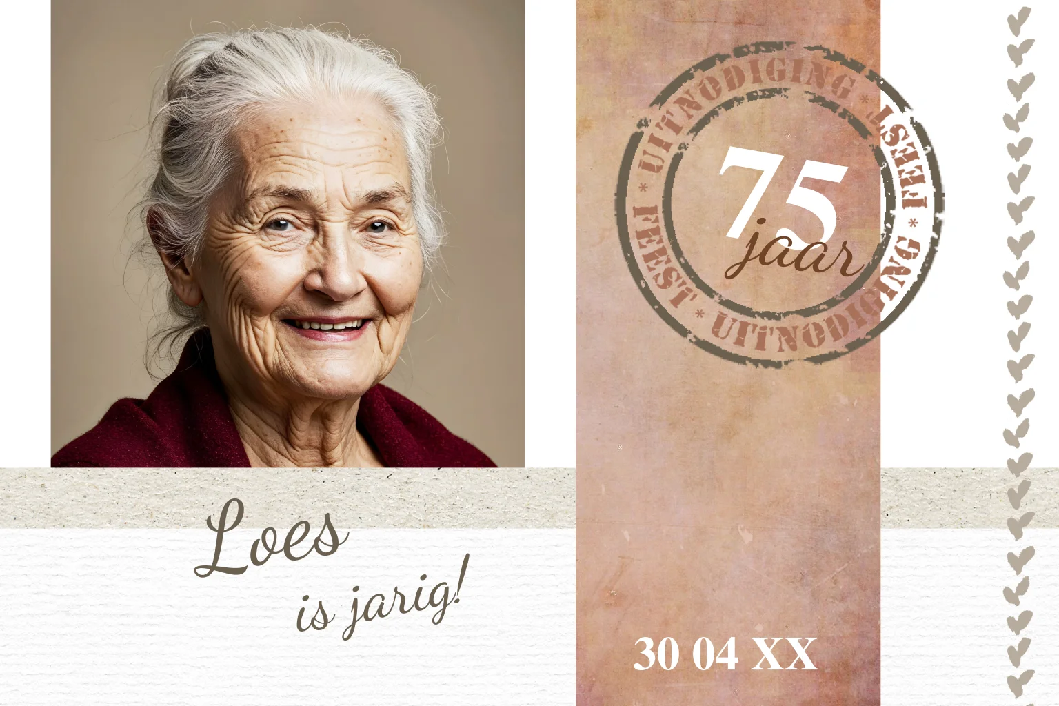 Een mooie uitnodiging voor een verjaardag 75 jaar met een leuke foto. Deze verjaardagsuitnodiging is geschikt voor man of vrouw en heeft een stempel met de tekst 'feest' en 'uitnodiging'. De kleuren en de leeftijd kun je zelf aanpassen.