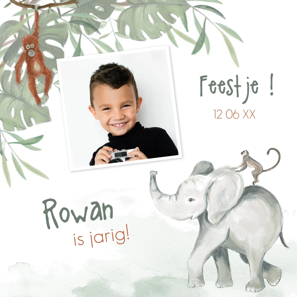 Een leuke uitnodiging met een foto van jullie zoontje en illustraties van een olifant en twee aapjes, takjes en blaadjes. Pas de teksten en leeftijd zelf eenvoudig aan. (30381)