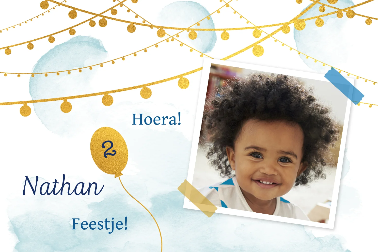 Een mooie uitnodiging voor een verjaardag met goudkleurige slingers en een ballon en een leuke foto van jullie zoontje. Deze verjaardagsuitnodiging met blauwe waterverf tinten kun je een meisjes achtige uitstraling geven door de kleuren blauw aan te passen naar bijvoorbeeld roze of oranje. Alle kleuren en teksten en de leeftijd kun je zelf aanpassen. (30373)