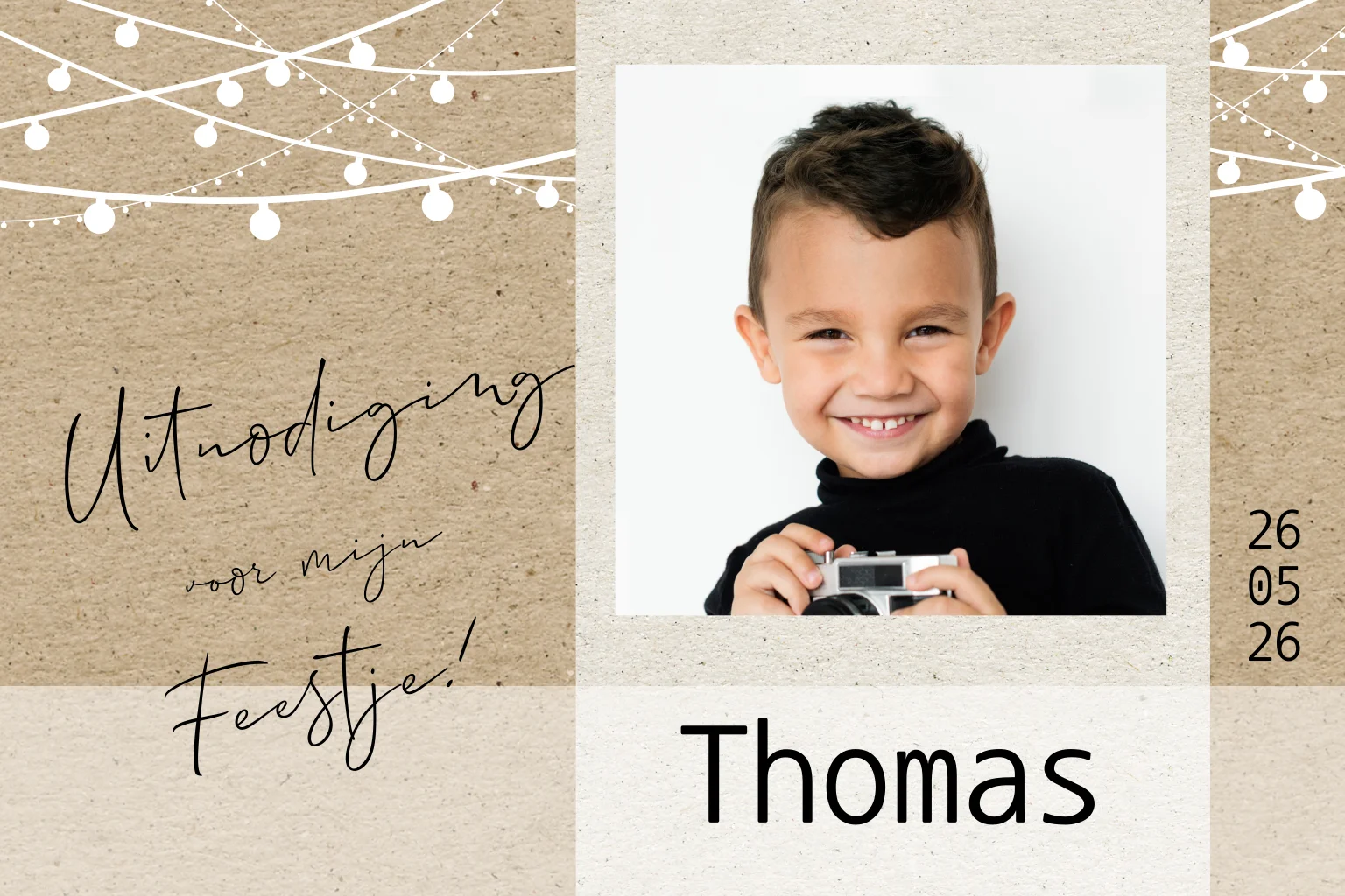 Uitnodiging verjaardag kinderfeestje foto kraft en slingers