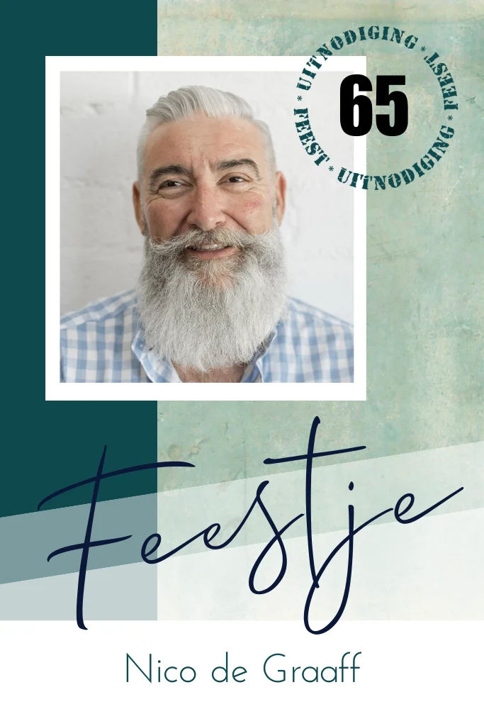 Deze uitnodiging voor een 65e verjaardag of jubileum kun je eenvoudig zelf personaliseren door de foto en teksten te vervangen. In de stempel met 'uitnodiging' en 'feest', kun je zelf jouw leeftijd aanpassen. Op de achtergrond een vintage vlak in groene tinten en schuine repen die een moderne uitstraling geven. 9x13, 10x15, 11x17, of 14x21 cm (30373)