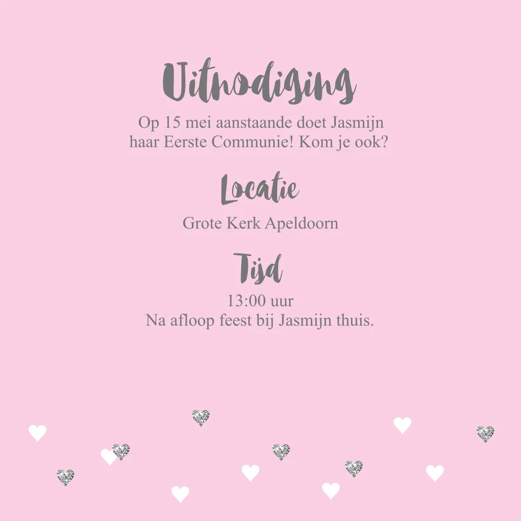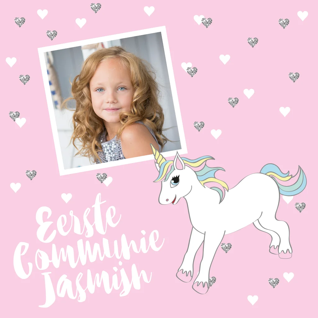 Een lieve, hippe communiekaart met eenhoorn, hartjes en foto. Pas zelf de teksten aan en vervang de foto. (6717)