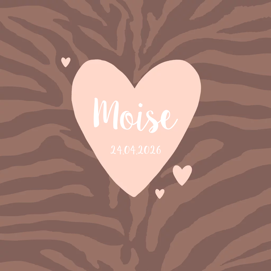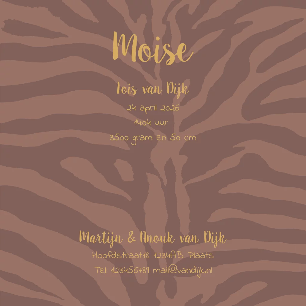 Een stoer geboortekaartje voor een meisje met zebraprint, hartjes en goudfolie voor een meisje. Pas de teksten aan en vervang eventueel de kleuren. (23608)