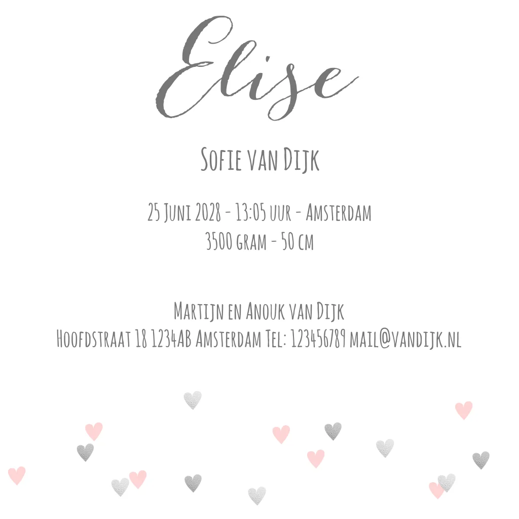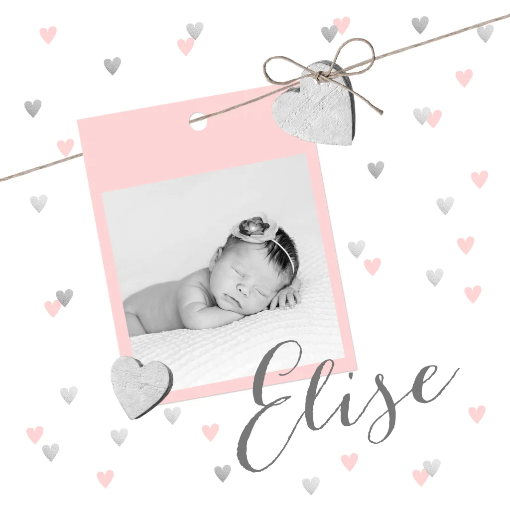Een lief meiden geboortekaartje voor een meisje met foto en hartjes. Vervang zelf de foto en pas de teksten aan. (5975)