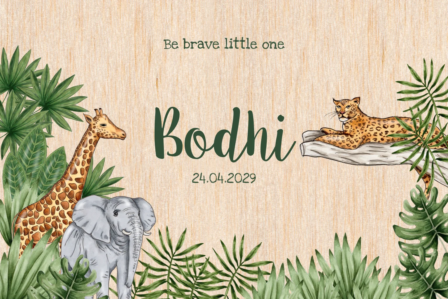 Jongens geboortekaartje gedrukt op echte hout met ronde hoeken en jungle illustratie voor een jongen. Pas zelf de teksten aan. (22244)