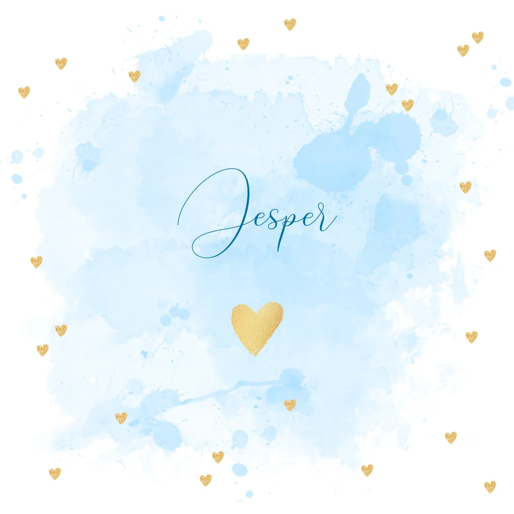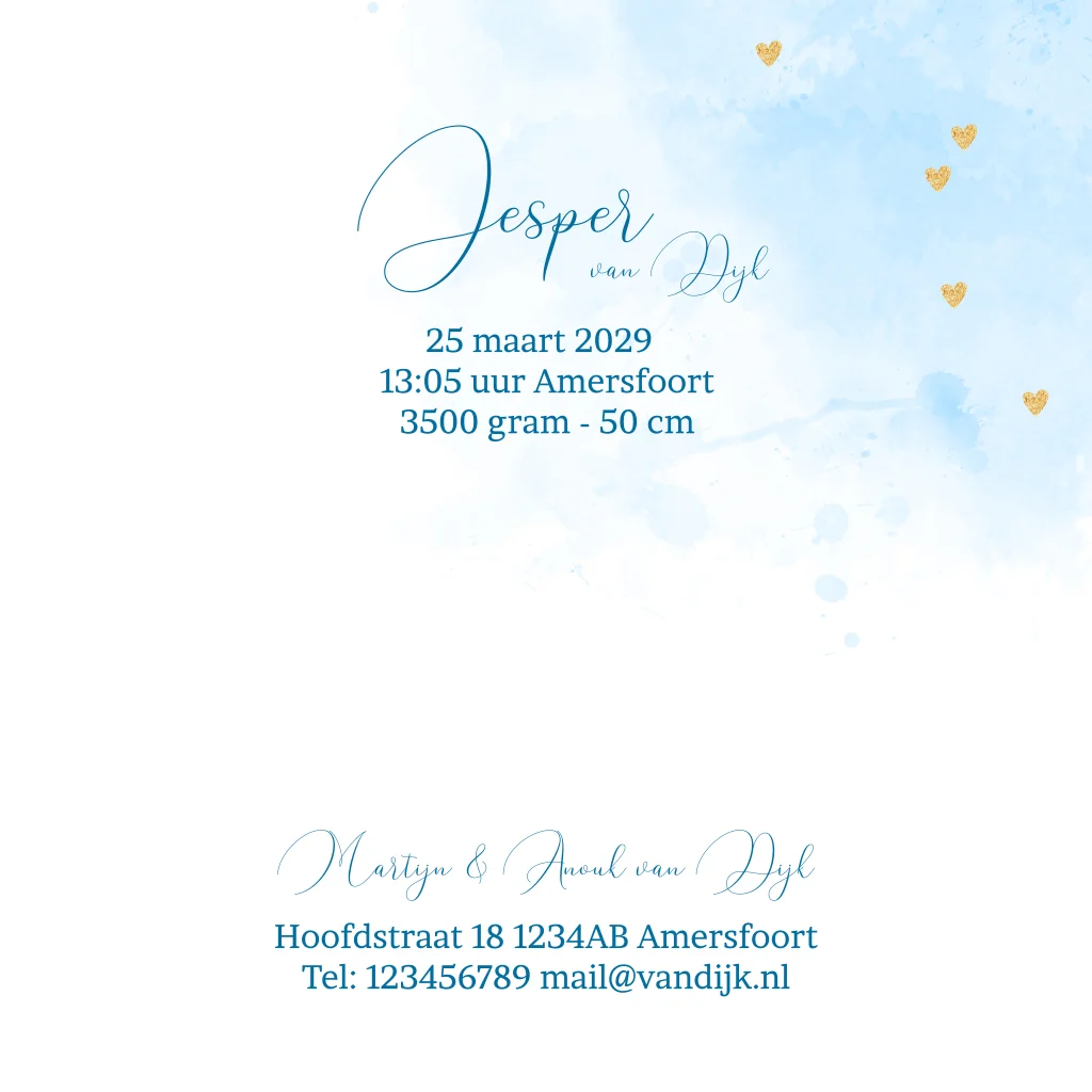Een lief geboortekaartje jongen met aquarel achtergrond en hartjes. Pas zelf de teksten aan. (7086)