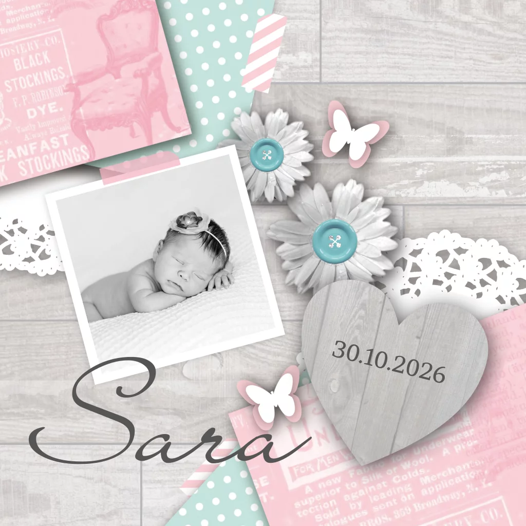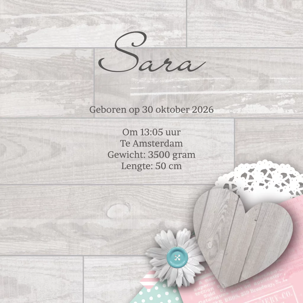 Een lief geboortekaartje voor een meisje met foto, hart, bloemen en mooie achtergrond. (4918)