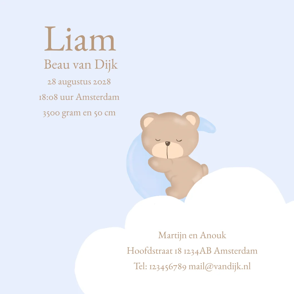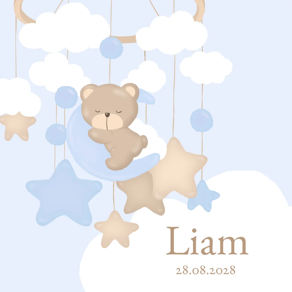 Een lief geboortekaartje met een beertje, maan, sterren en wolken aan een mobiel, voor een jongen. Pas zelf de teksten aan en vervang eventueel de achtergrondkleur. (24306) Geboortekaartje Liam