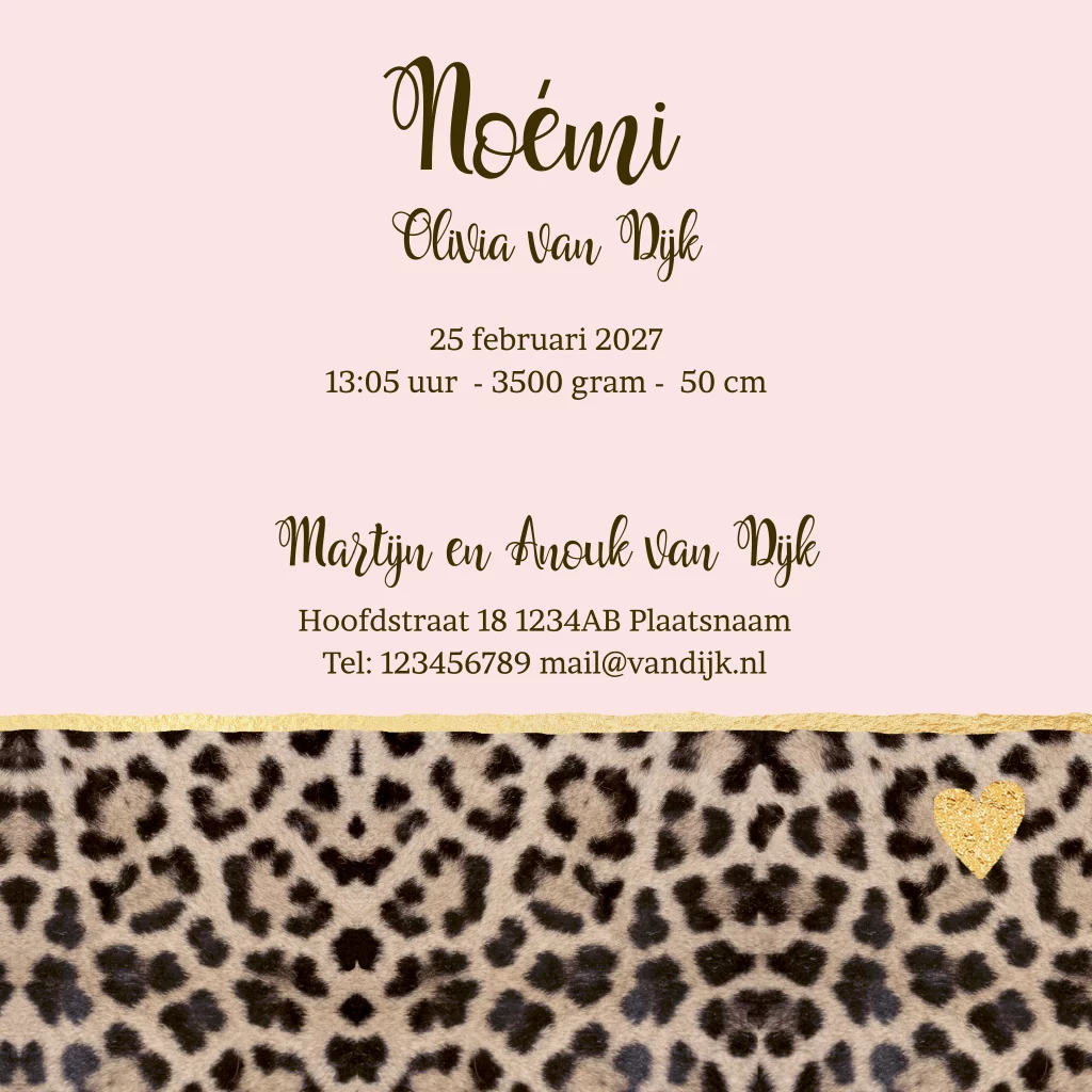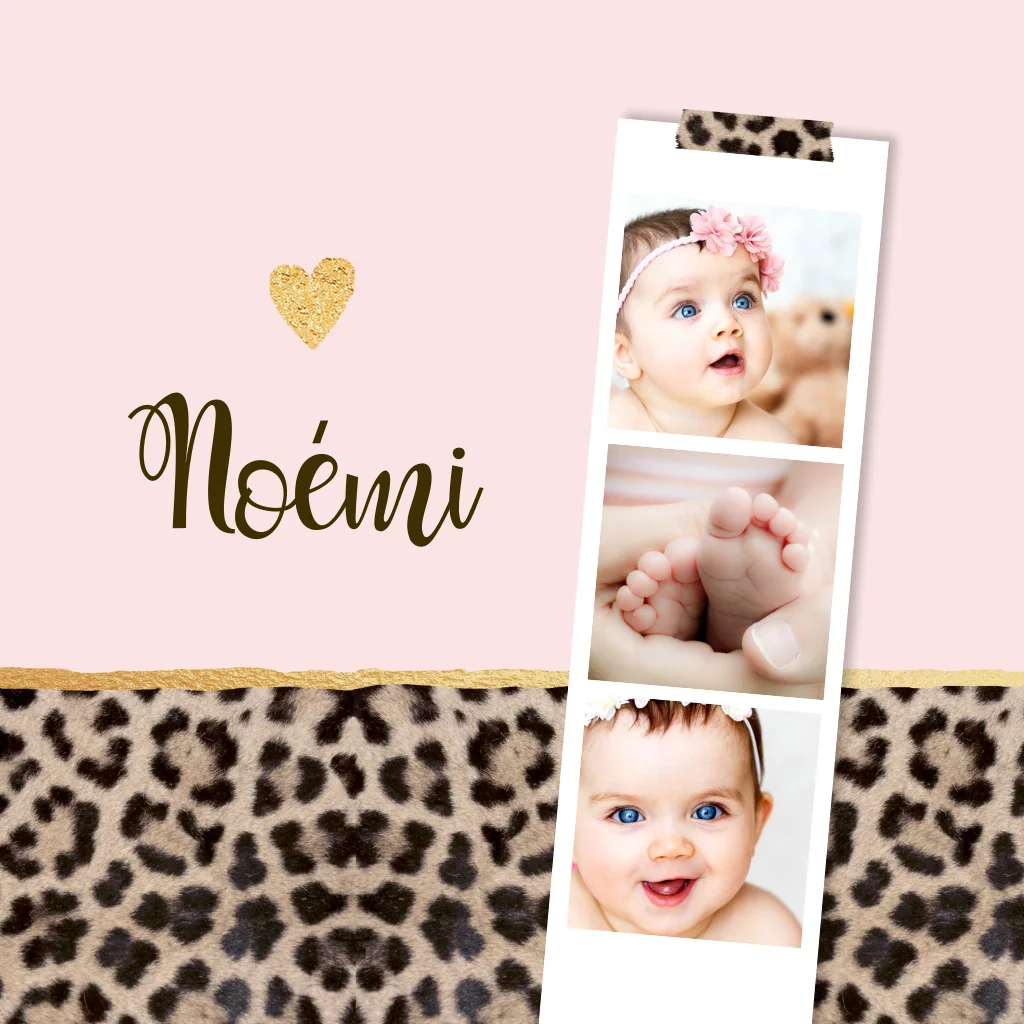 Een hip meisjes geboortekaartje met panterprint, fotostrip en hartje. De roze achtergrondkleur is aanpasbaar. Vervang ook de foto's en pas de tekst aan. (7928)