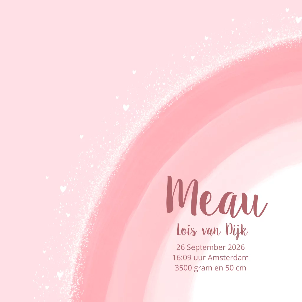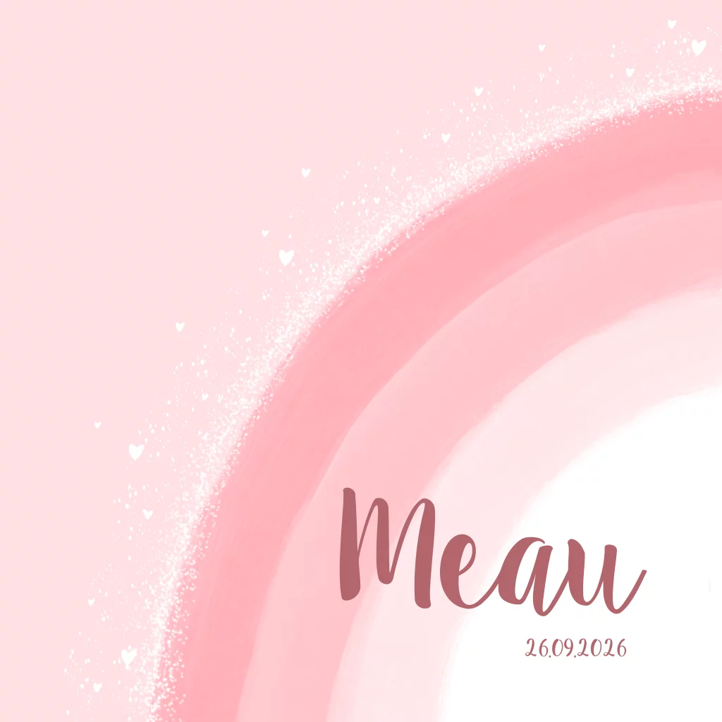 Een lief geboortekaartje met een roze regenboog en hartjes voor een meisje. Pas zelf de teksten aan. (23391) Geboortekaartje Meau