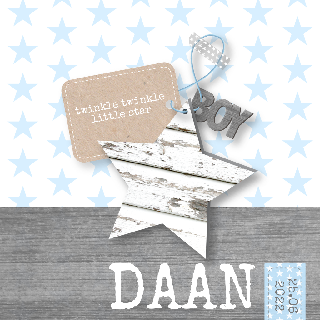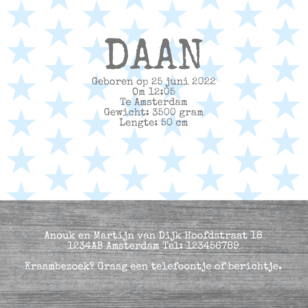 Een stoer geboortekaartje met sterren, label en houtlook. (4948)