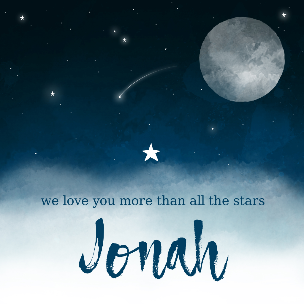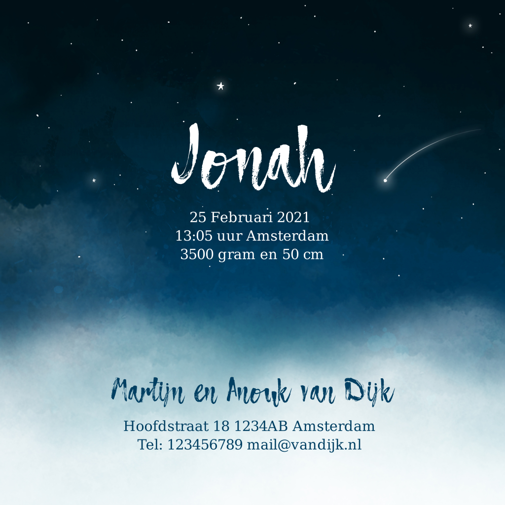 Een hip en stoer geboortekaartje met sterren, maan en wolken voor een jongen. Pas zelf de teksten aan. (8292)