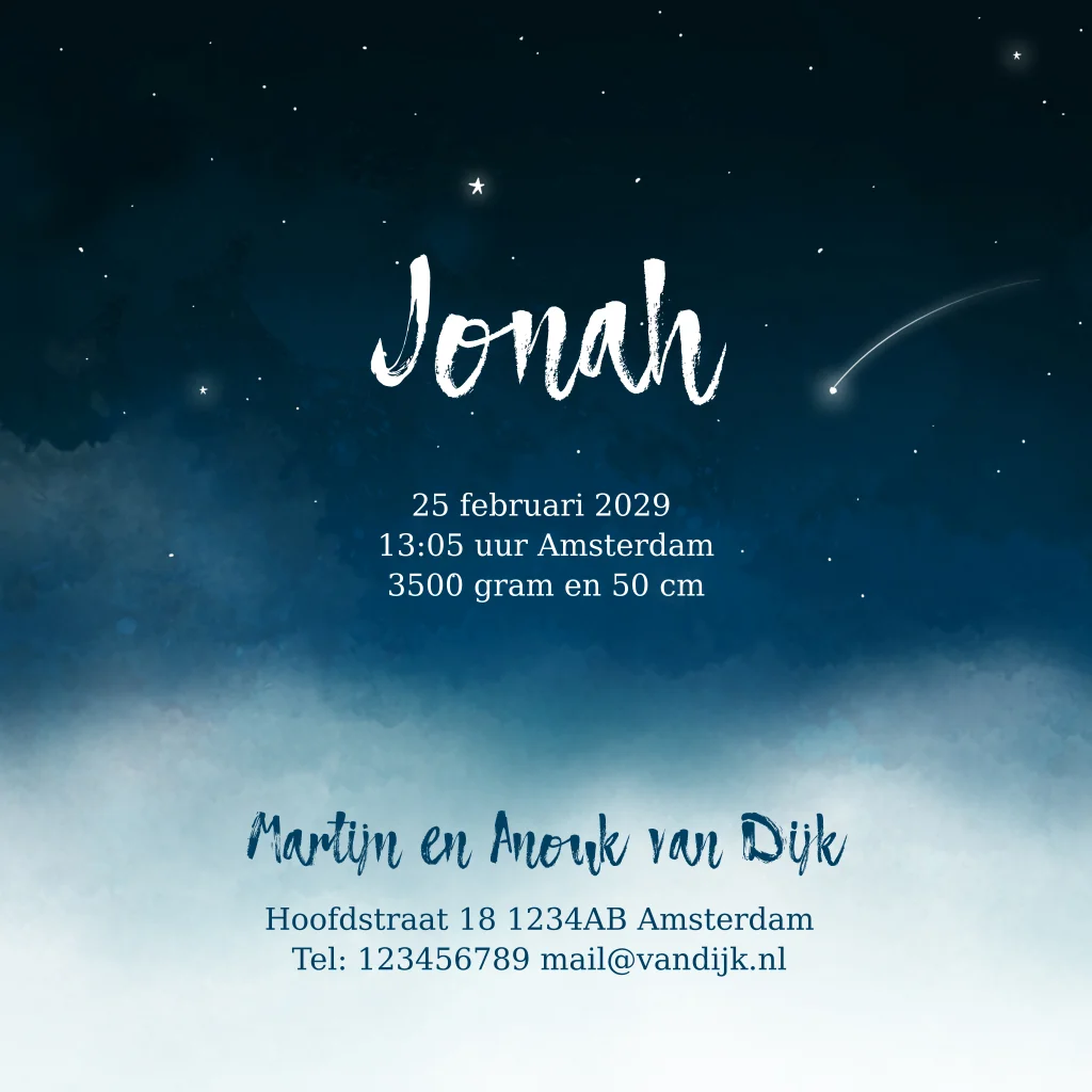 Geboortekaartje jongen sterren, maan, wolken