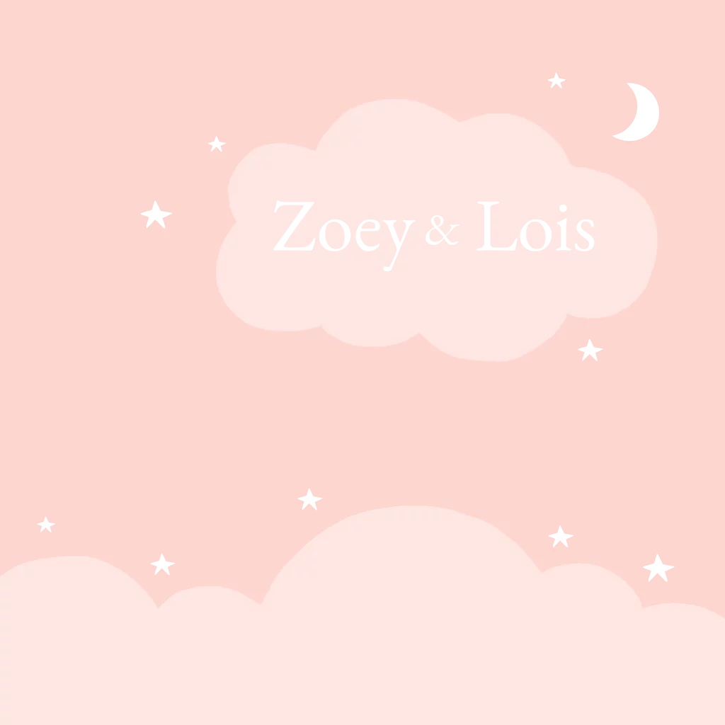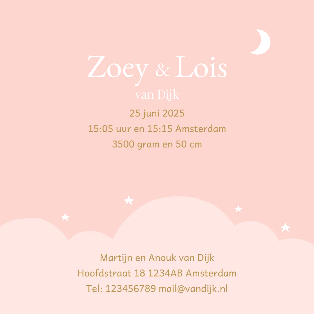 Geboortekaartje tweeling roze wolken, sterren en maan