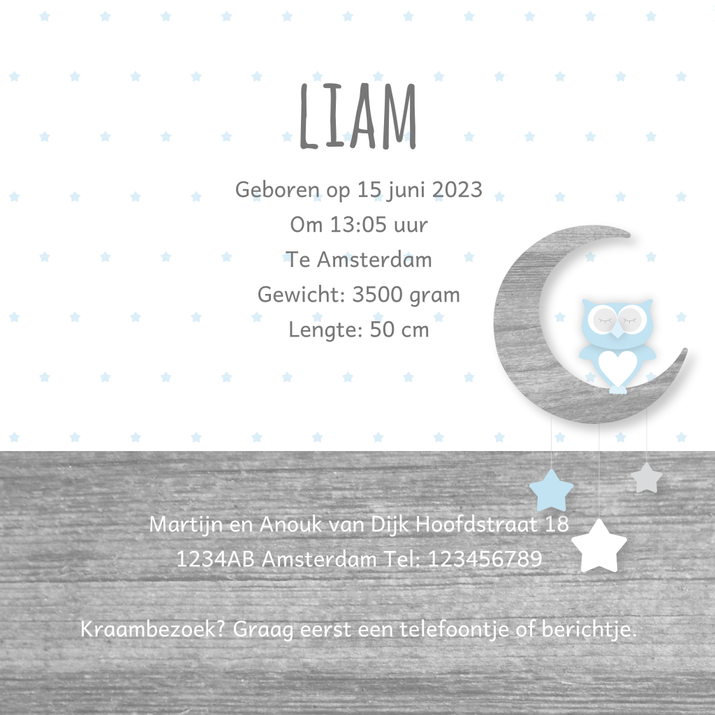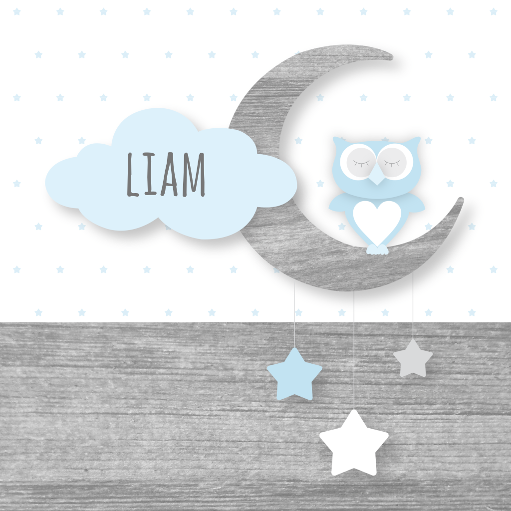 Een lief geboortekaartje voor een jongen, met een uiltje, maan, wolkje en sterren. (4916)