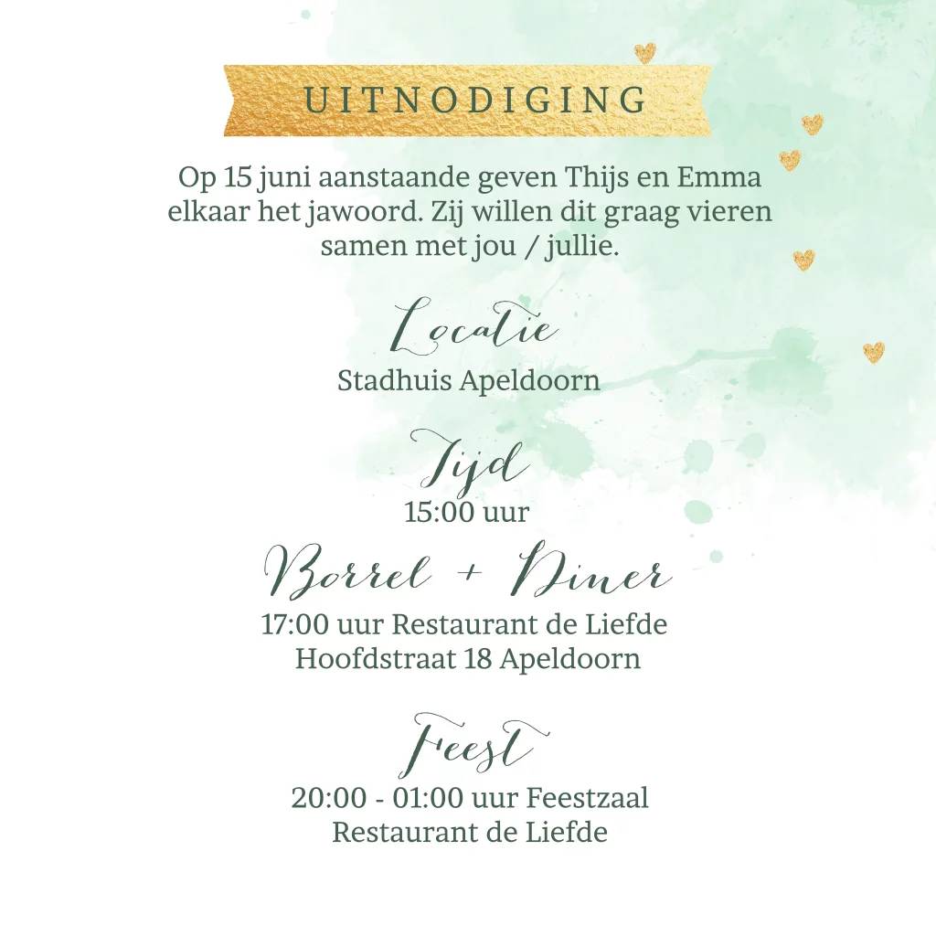Een hippe, stijlvolle uitnodiging geregistreerd partnerschap met aquarel achtergrond, goudkleurige hartjes en tekst. Pas zelf de teksten aan. (6500)