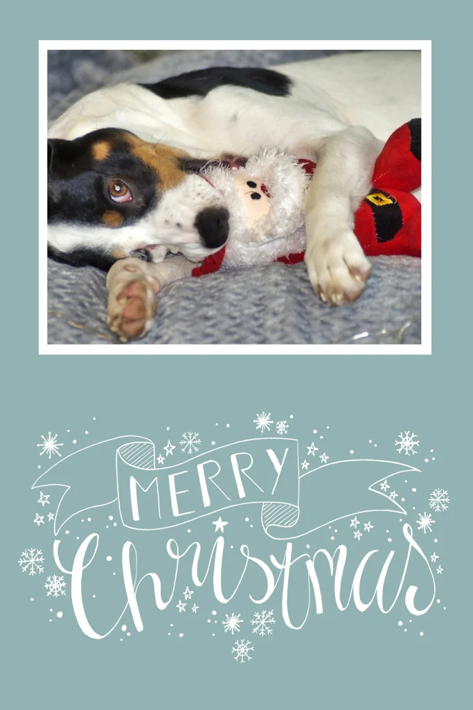 Een mooie kerstkaart met foto van een hond en handlettering. Alle kleuren zijn aanpasbaar. Vervang ook de foto. (20475)