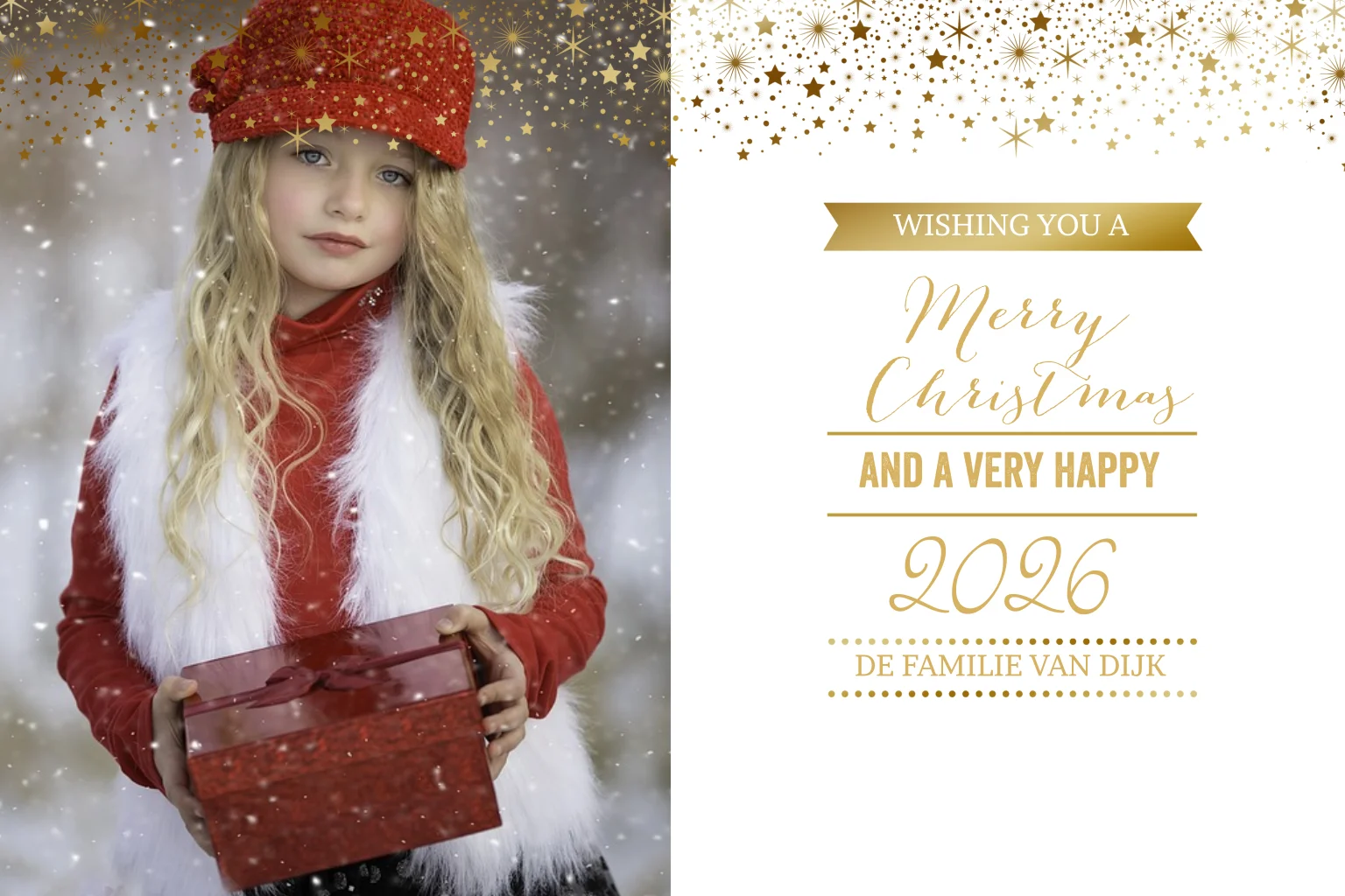 Een mooie kerstkaart met foto en sterren in goudlook. De witte achtergrond is aanpasbaar. Vervang ook de foto en pas de tekst aan. (7690)