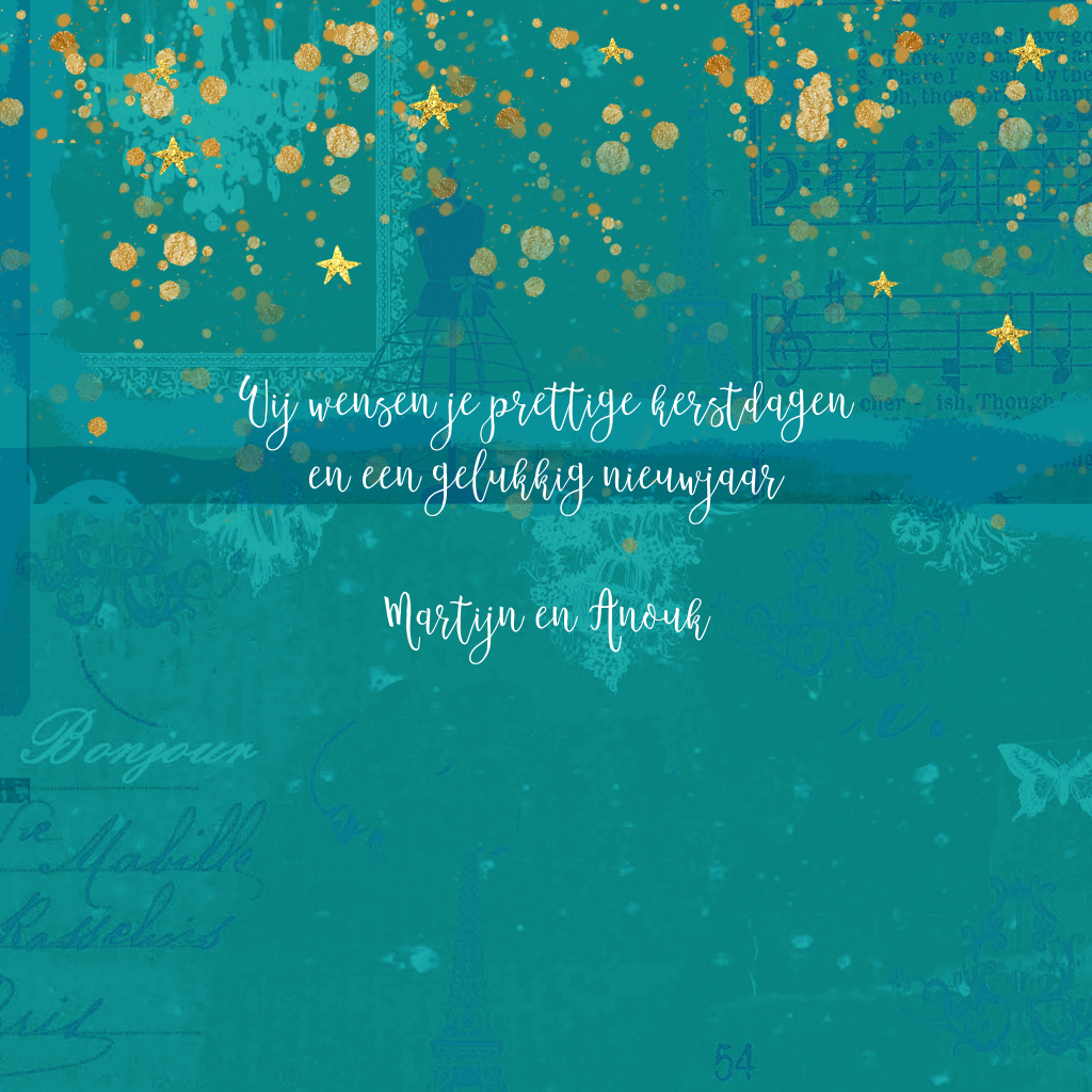 Een mooie kerstkaart met een kleurrijke kerstbal en goudlook. Pas zelf de teksten aan. (23771)