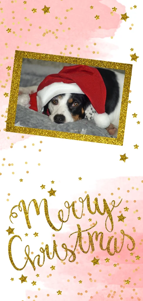Een hippe, langwerpige kerstkaart met foto, aquarel achtergrond, sterren en glitterprint. Vervang zelf de foto van het huisdier of je hond en pas de tekst op de achterkant aan. (6058)
