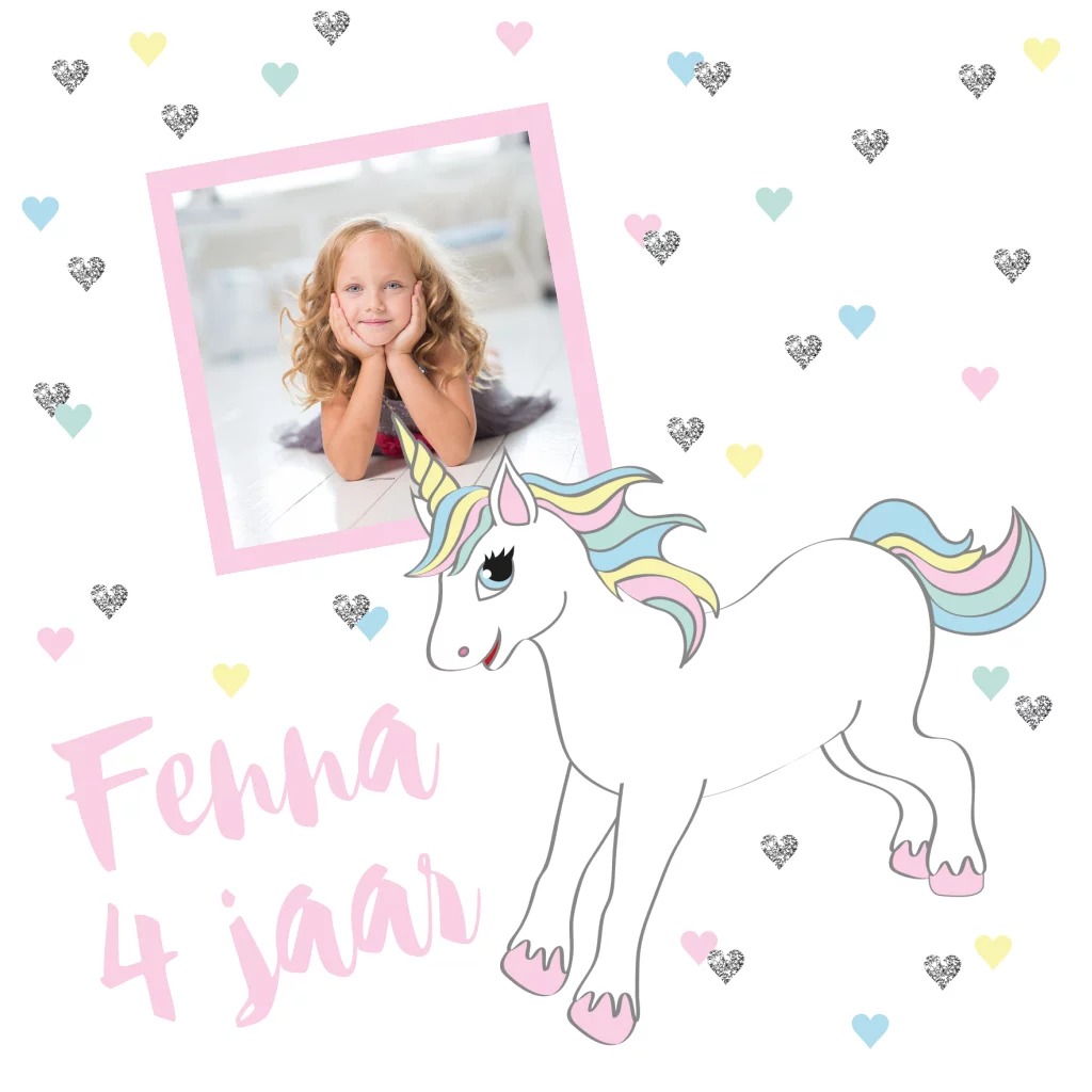 Een lieve, hippe uitnodiging voor een kinderfeestje, met een eenhoorn, hartjes en foto. Vervang zelf de foto en pas de teksten aan. (6421)