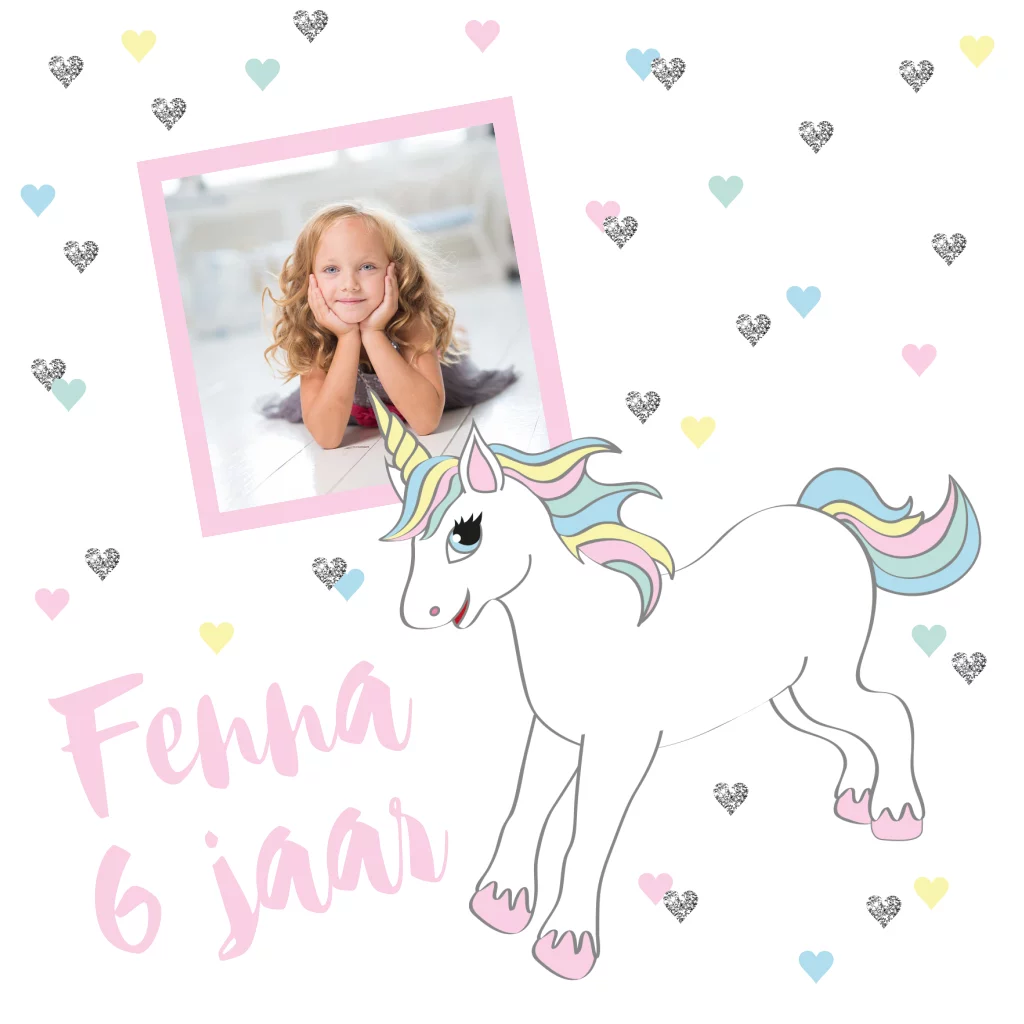 Een lieve, hippe uitnodiging voor een kinderfeestje, met een eenhoorn, hartjes en foto. Vervang zelf de foto en pas de teksten aan. (6421)
