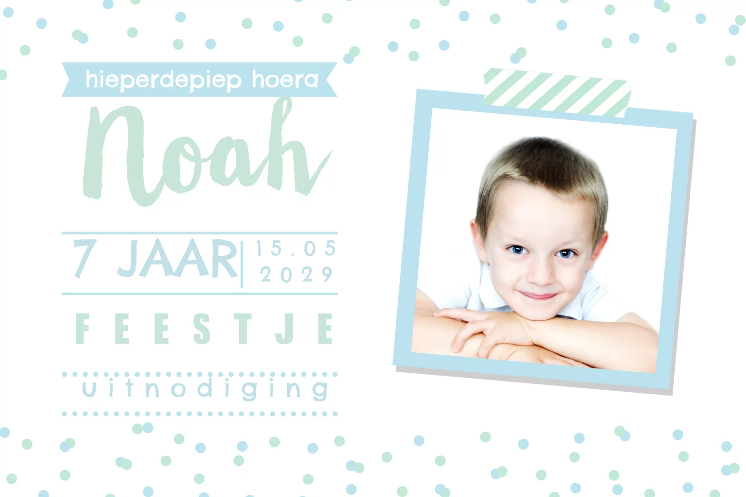 Een leuke uitnodiging voor een kinderfeestje, met eigen foto, confetti en tekst. (4935)