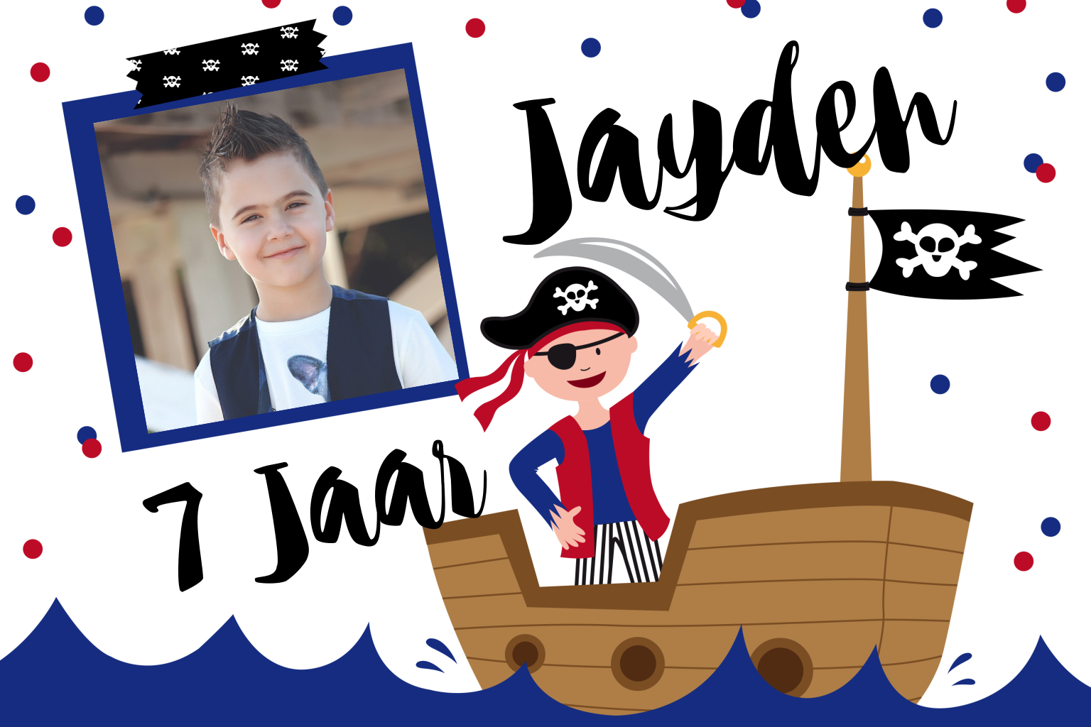 Een leuke, stoere uitnodiging met piraat, foto en confetti voor een kinderfeestje. Vervang zelf de foto en pas de teksten aan. (6718)