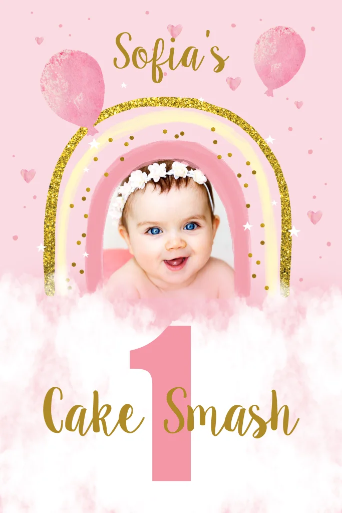 Een schattige uitnodiging voor een kinderfeestje, met regenboog, foto en ballonnen. Vervang zelf de foto en pas de teksten aan. (23909)