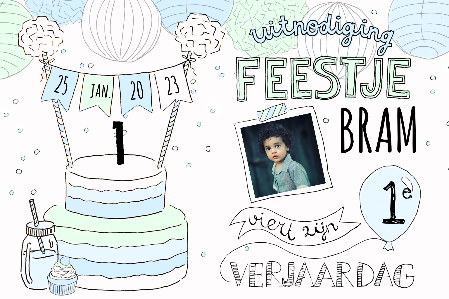 Een leuke, originele uitnodiging voor een kinderfeestje, met taart en mooie versieringen in pasteltinten. (4948)