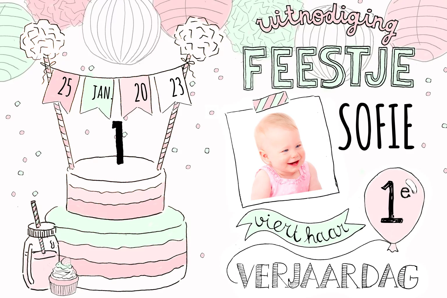 Een leuke, originele uitnodiging voor een kinderfeestje, met taart en mooie versieringen in pasteltinten. (4948)