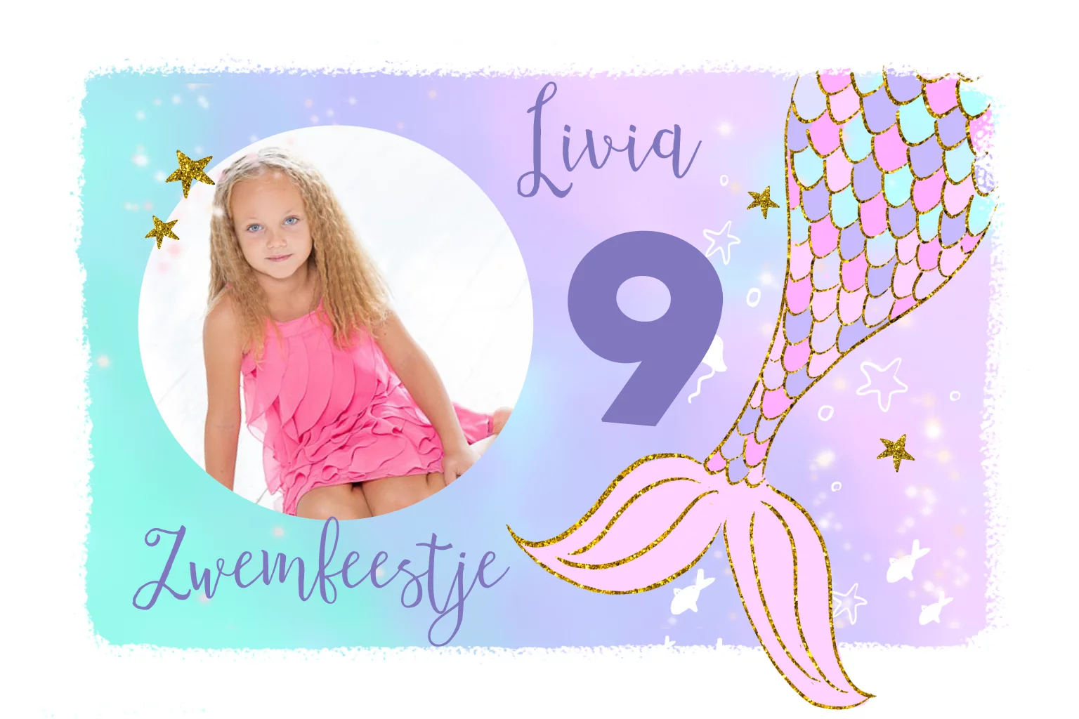 Een mooie uitnodiging voor een zwemfeestje, met zeemeerminnenstaart, foto en glitterlook. Vervang zelf de foto en pas de teksten aan. (23291)