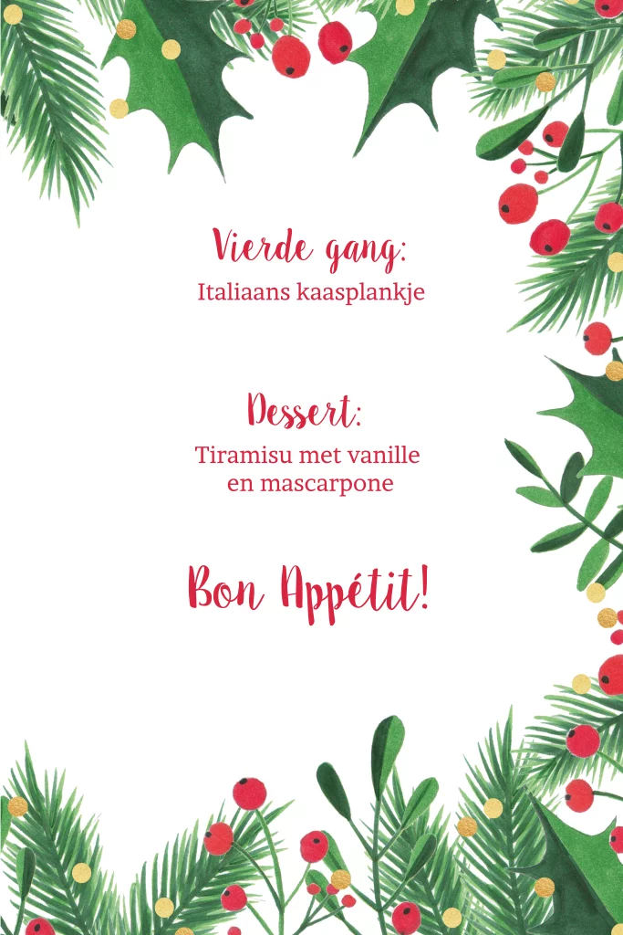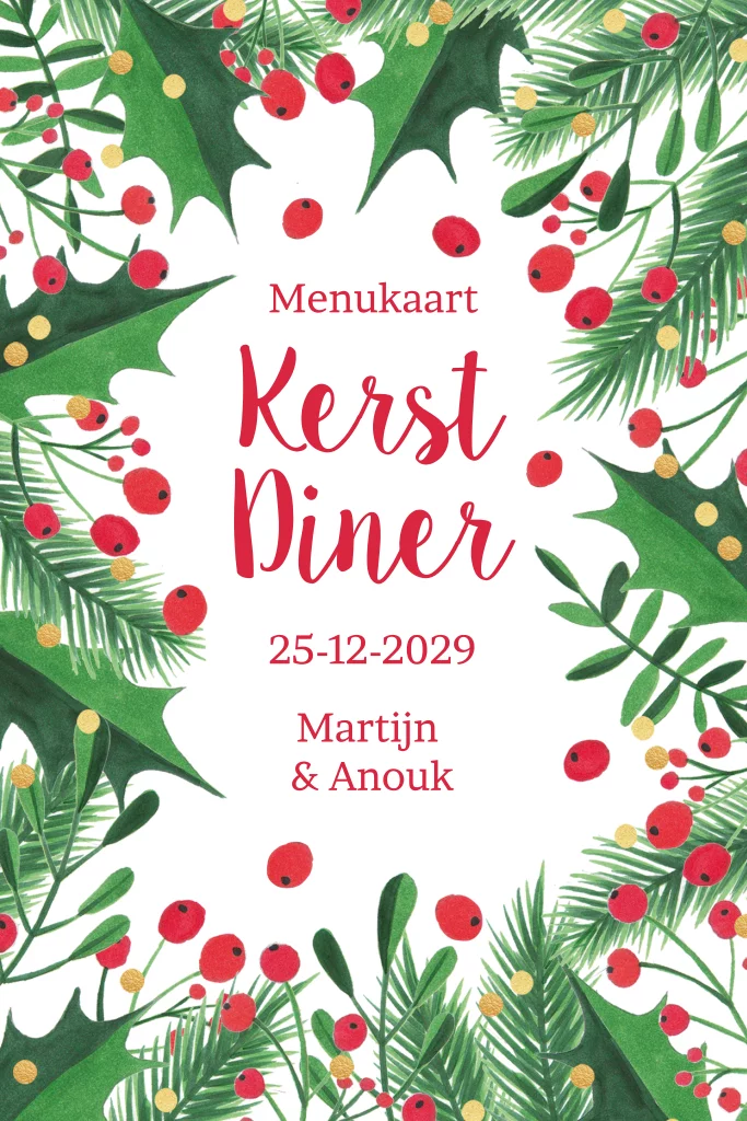 Een mooie menukaart voor een kerstdiner, met kersttakken, hulstbladeren en confetti. Pas zelf de teksten aan. (7683)