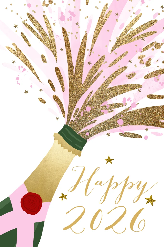 Een hippe zakelijke nieuwjaarskaart met een champagnefles en glitterlook. Pas zelf de teksten aan en vervang eventueel de achtergrondkleur. (23771)