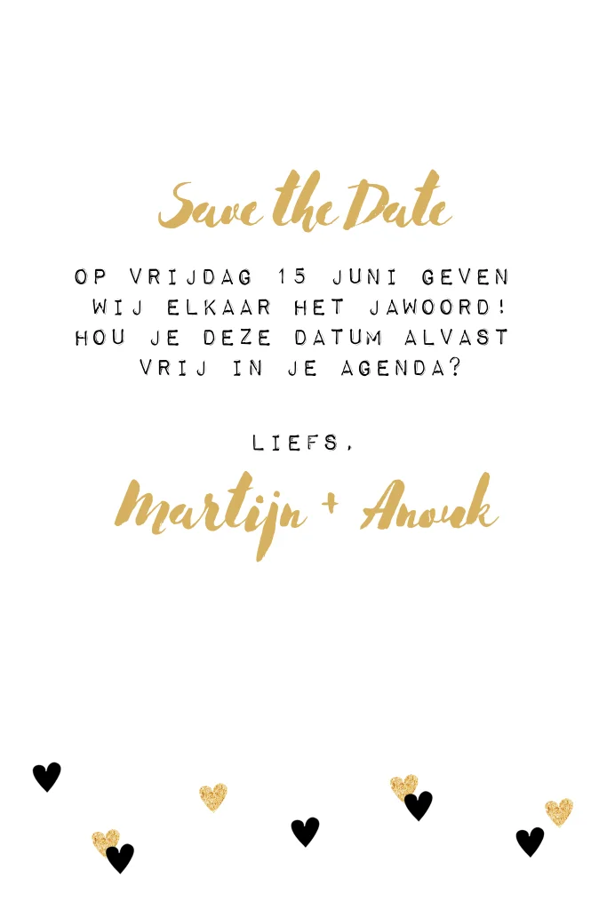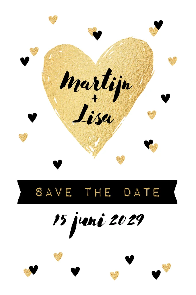 Save the date kaart hartjes goud zwartwit