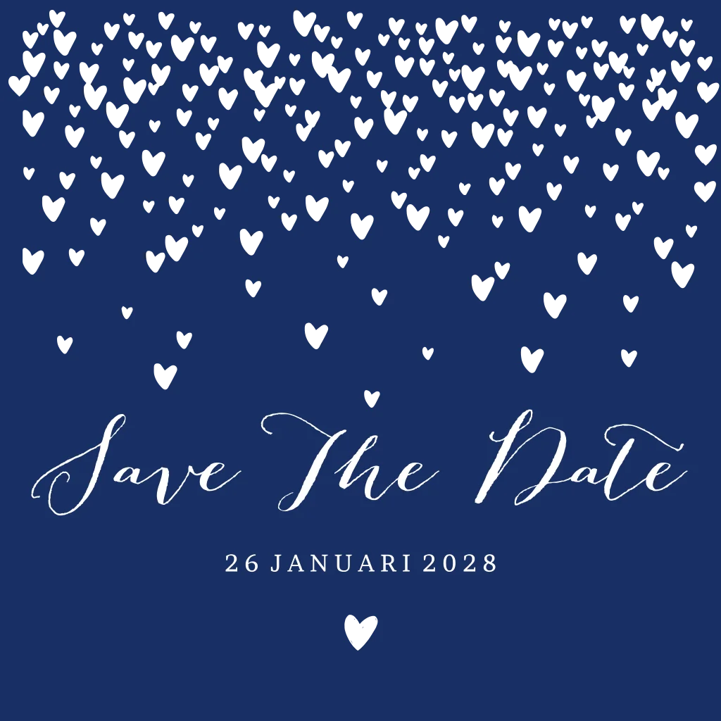 Een stijlvolle save the date kaart trouwen met hartjesregen in goudfolie. Alle kleuren zijn aanpasbaar. Pas ook de teksten aan. (20866)