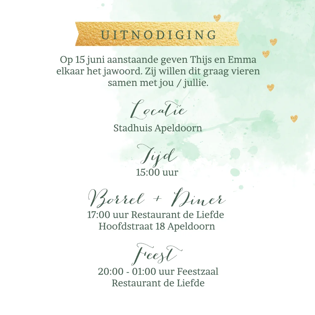 Trouwkaart aquarel groen hartjes tekst