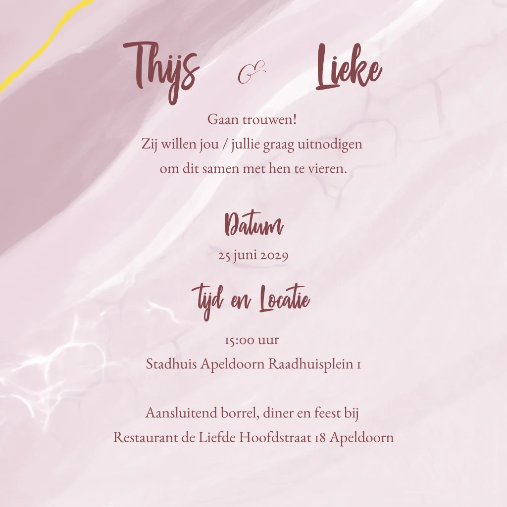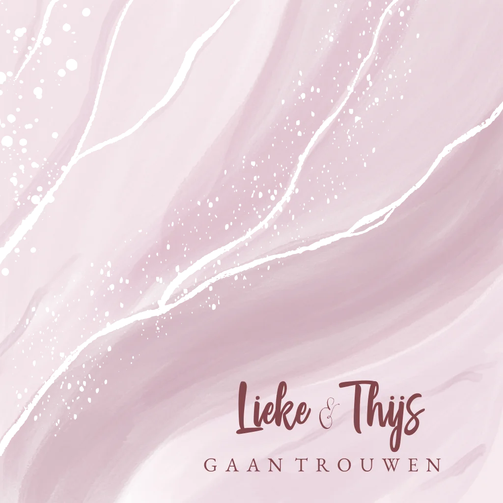 Een unieke kleurrijke trouwkaart met roze kleur op marmerlook achtergrond en goudfolie. Pas zelf de teksten naar wens aan. (23440)let op: het kan zijn dat de lijntjes goud niet helemaal tot de rand lopen, dit is helaas niet altijd doorlopend te krijgen met foliedruk.