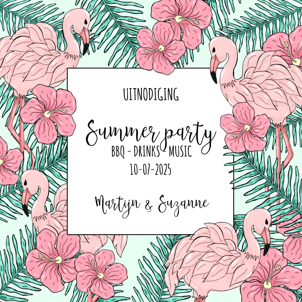 Een hippe uitnodiging voor een feest, met flamingo's, bloemen en palmbladeren. (5305)