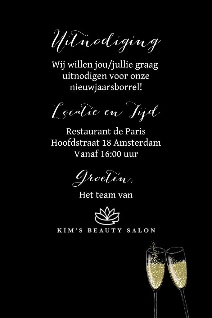 Uitnodiging nieuwjaarsborrel champagnefles en -glazen