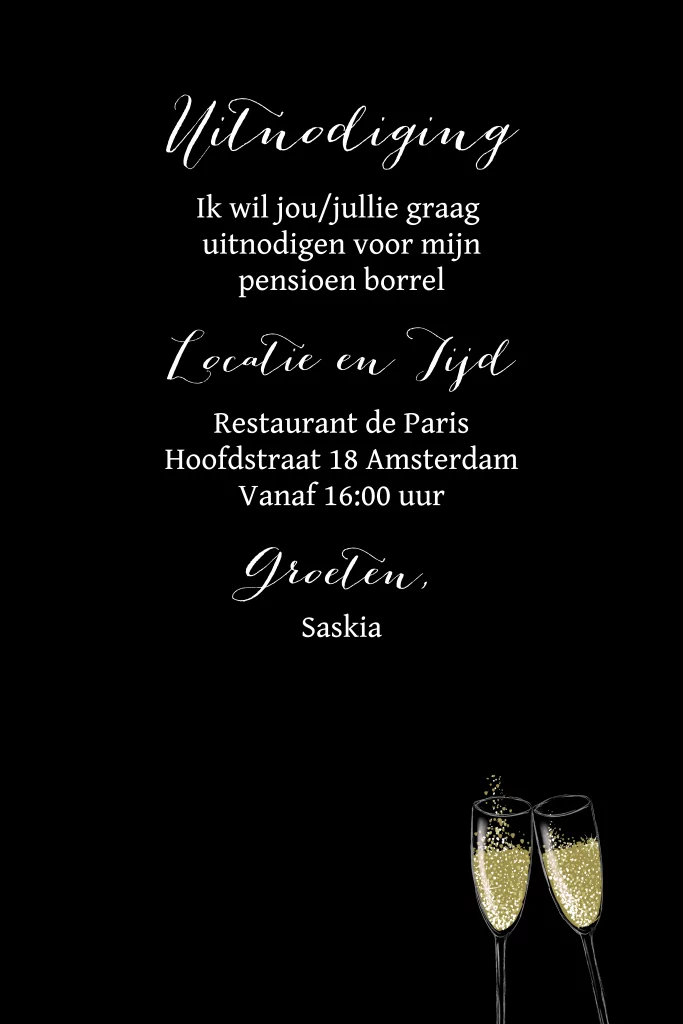 Een feestelijke uitnodiging voor een pensioen borrel, met een champagnefles en -glazen. Pas zelf de teksten aan en vervang eventueel de achtergrondkleur. (23493)