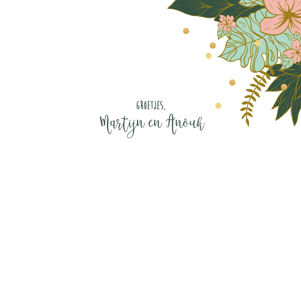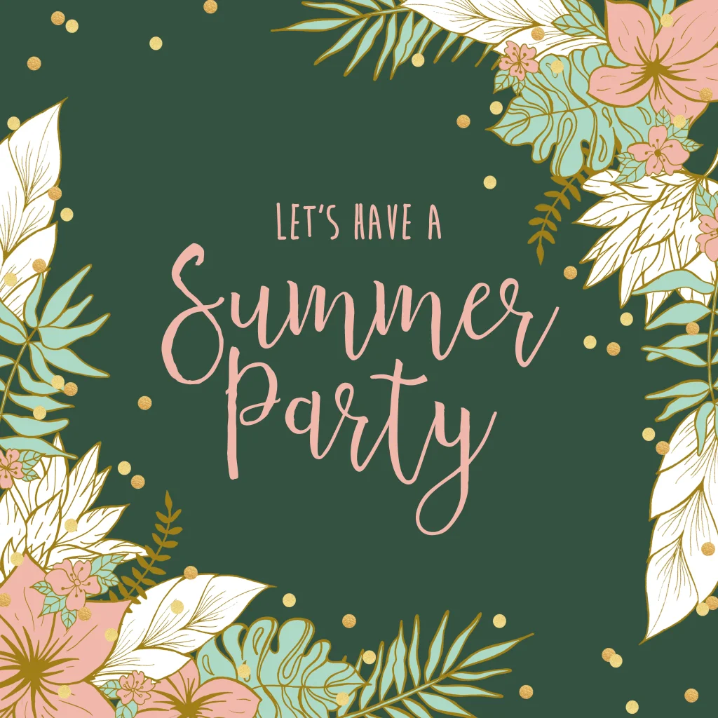 Een mooie uitnodiging voor een tuinfeest, met tropische bloemen en goudkleurige confetti. De groene achtergrondkleur is aanpasbaar. Pas ook de teksten aan. (8626)
