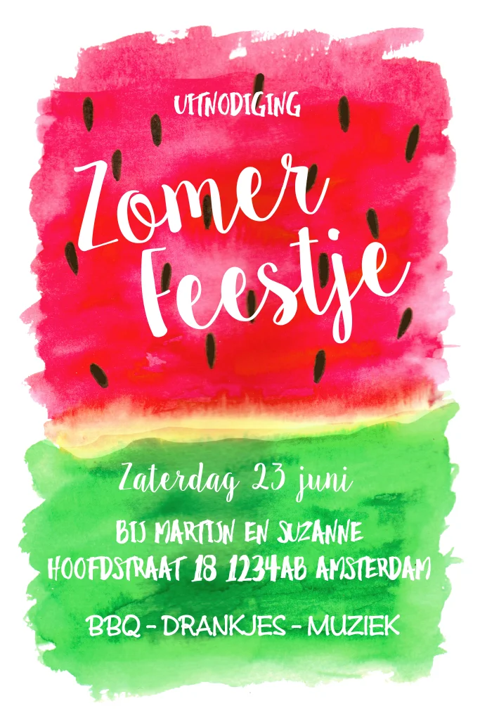 Een hippe uitnodiging voor een tuinfeest, met een aquarel van een watermeloen. Pas zelf de teksten aan. (7226)