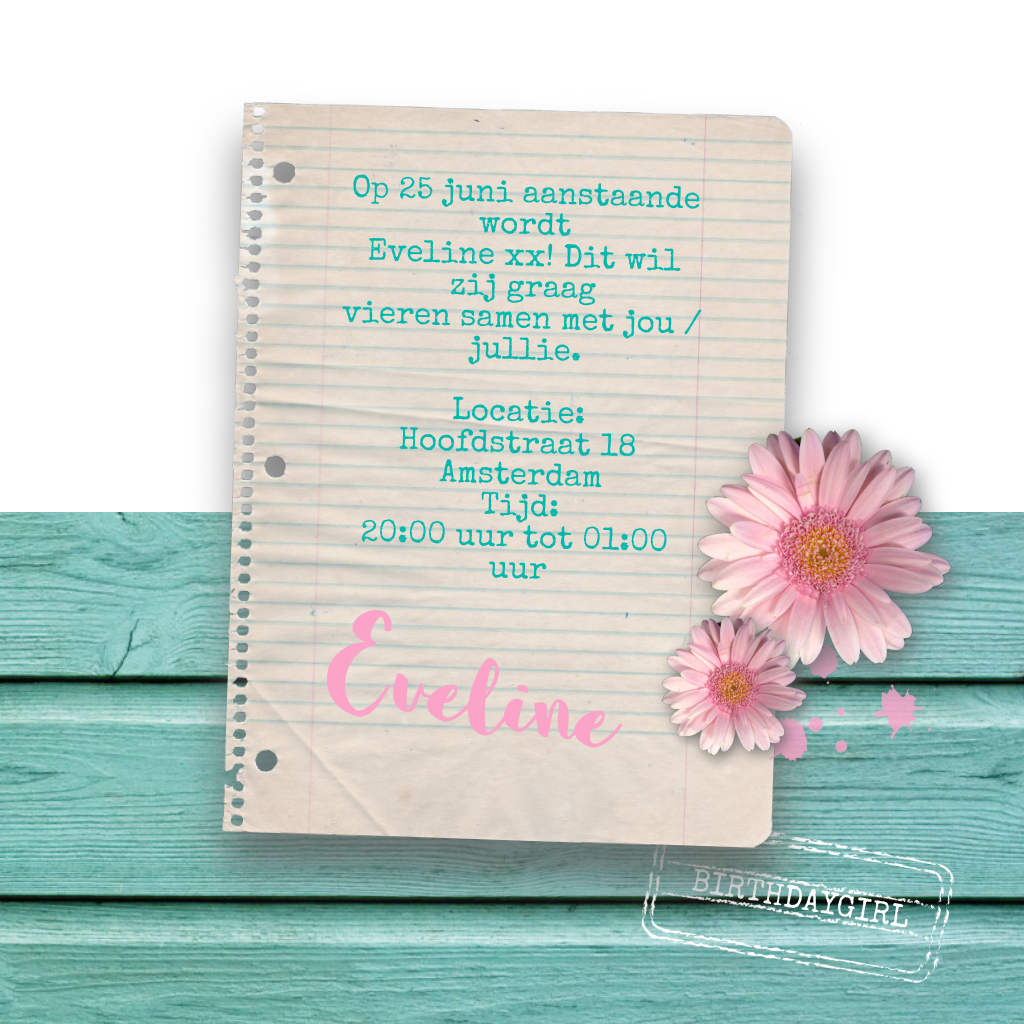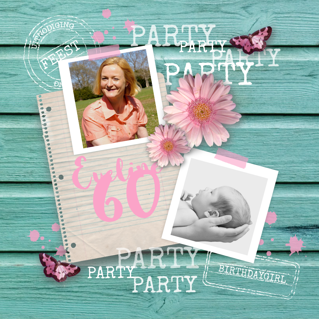 Een leuke, originele uitnodiging voor een 60e verjaardagsfeest, met bloemen, vlinders, houtlook en foto's. (5010)