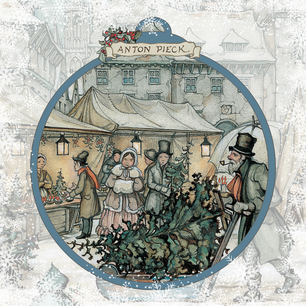 Anton Pieck kerstkaart van de kerstmarkt met een kerstbal frame. (21894)